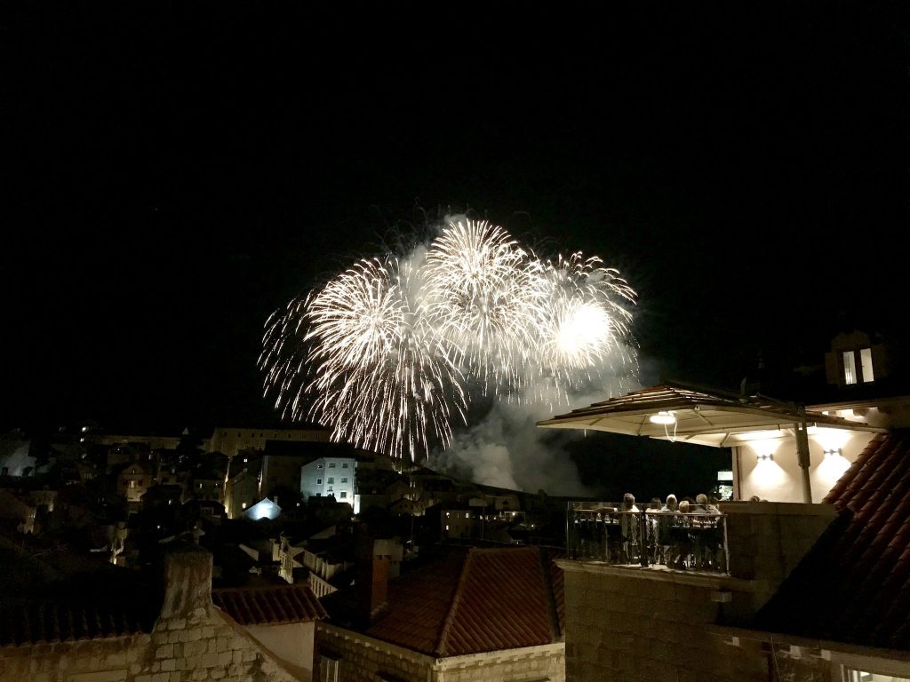 Eikä se onnellisuus laimentunut ollenkaan katsellessani auringonlaskua kaupungin yläpuolella. Ei haitannut odottaa cable cariin pääsyä muiden turistien seassa enkä ärsyyntynyt lukuisten selfieiden ottajistakaan. Dubrovnikin taika oli saanut minusta ihmeellisen otteen. Kun sitten vielä istuin itsekseni illalliselle viinilasin ääreen ja söin taivaallisia ravioleja yhdessä tunnelmallisessa pikkukujan ravintolassa, totesin että päiväni on ollut täydellinen. Enpä arvannut, että iltani huipentuisi vielä ilotulituksiin, jotka katsoin omalta pikku kattoterassitani ennen kuin tyytyväisenä ja onnellisen uupuneena painoin pääni tyynylle.