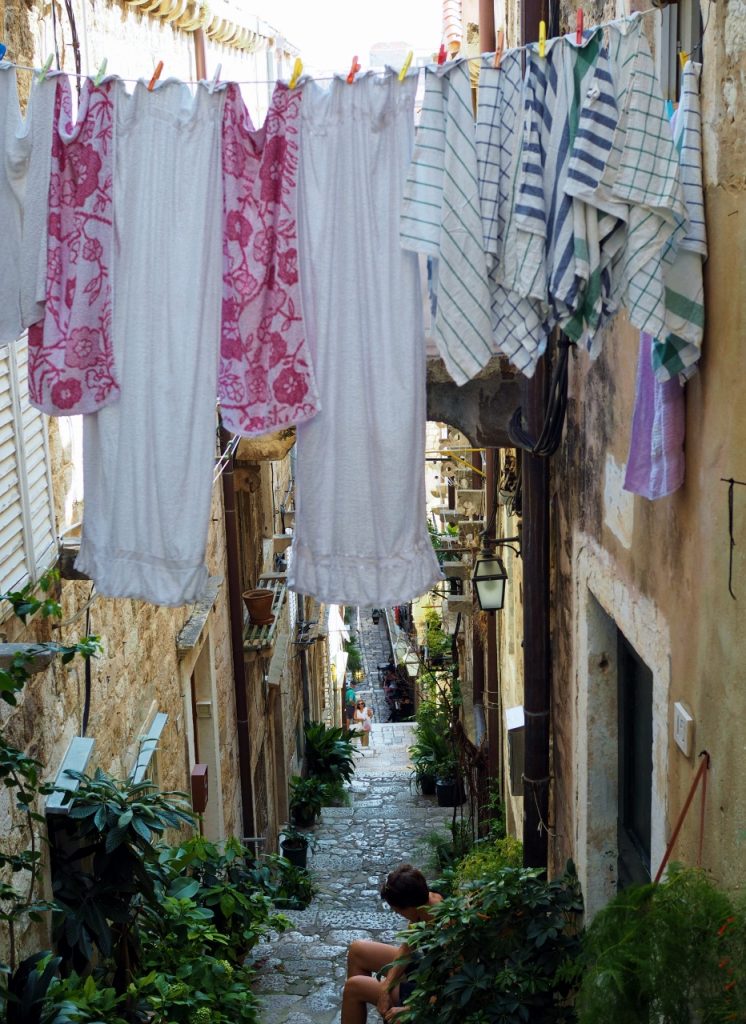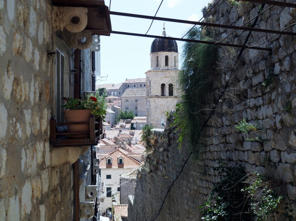 Avaimet saatuani en malttanut kuin nopeasti vilkaista huonettani ja kurkistaa huikean näköalan tarjoavalle kattoterassilleni. Minulla oli kuitenkin palo lähteä tutkimaan kaupunkia heti. Lähdin kuljeskelemaan päämäärättömästi pikkukujia pitkin. Ensimmäiseksi nousin kotikatuni portaat huipulle saakka. Mitkä ihanat näkymät sieltä olikaan pyykkinarujen ja kujaa reunustavien köynnösten läpi kirkontornille ja punaisille katoille. Stradunin vilinä oli täältä kaukana ja hetken aikaa ainoat elävät olennot, jotka kohtasin olivat pari kissaa ja puluja. Lämmin onnentunne purkautui jossain syvällä sydämessä. Dubrovnik – pääsit kyllä heti yllättämään. Kaikki ovat sinua hehkuttaneet, mutta ajattelin, että minä en lankeaisi  näin helpolla.